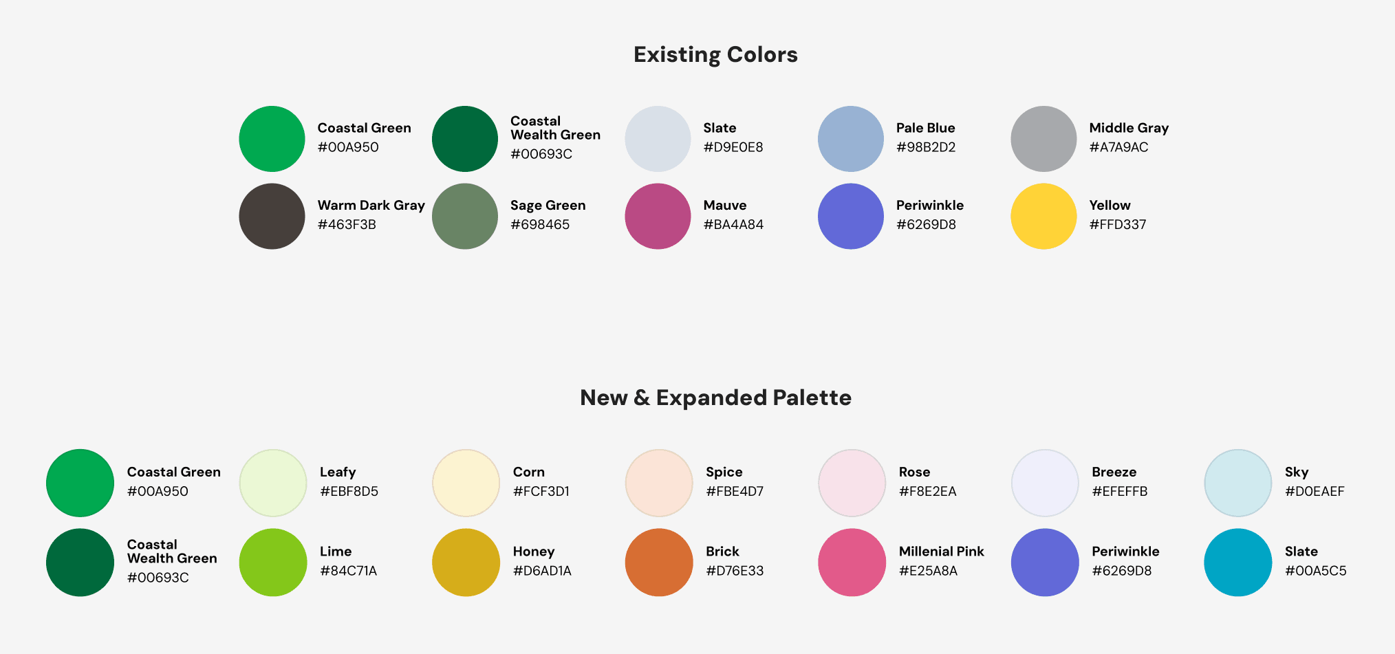 Like with typography, Coastal had an established set of colors. This palette once was indicative of a moment in time, but unfortunately, that time had passed. Using the core brand greens and the accents, I added and adjusted supporting colors; broadening the palette to provide a new color set that allowed for flexibility and vibrancy. I added a set of pastels, each with a dedicated pair, to ensure proper, accessible contrast when used in text applications and icons. The result was a suite of colors that felt fresh and energetic, but uniquely Coastal.
