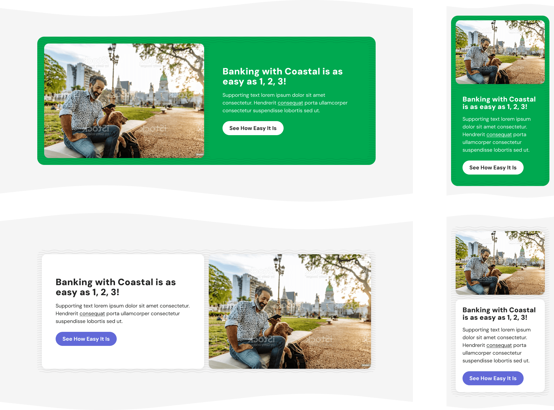 With our visual direction established, I began the work of extending the design language into a system of reusable, swappable components. I included a number of visual options for each, allowing them to adjust the visual intensity of their web content as needed. I took great care to build-in spacing and scaling for these visual elements, so that regardless of the length of content within each component, the system will respond accordingly.