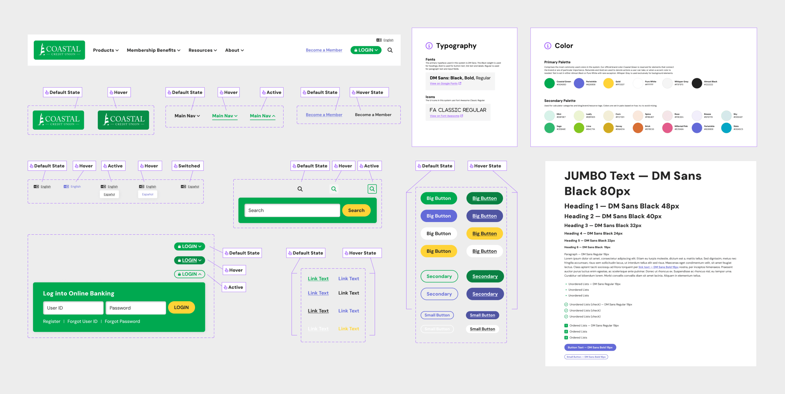 Your ideas are only as good as how well you can communicate them, and a design system is no exception. An important piece of the puzzle involved detailing our decisions in a comprehensive handoff file, delivered via Figma. Though we had direct contact with our third-party developer throughout the process, I designed the file to be one that could be picked up by any developer, with no context, and allow them to easily execute a build from it. The file has dedicated Figma pages both with broad and specific annotations each for typography, color palette, components and their variations, navigational elements, buttons, links and more.